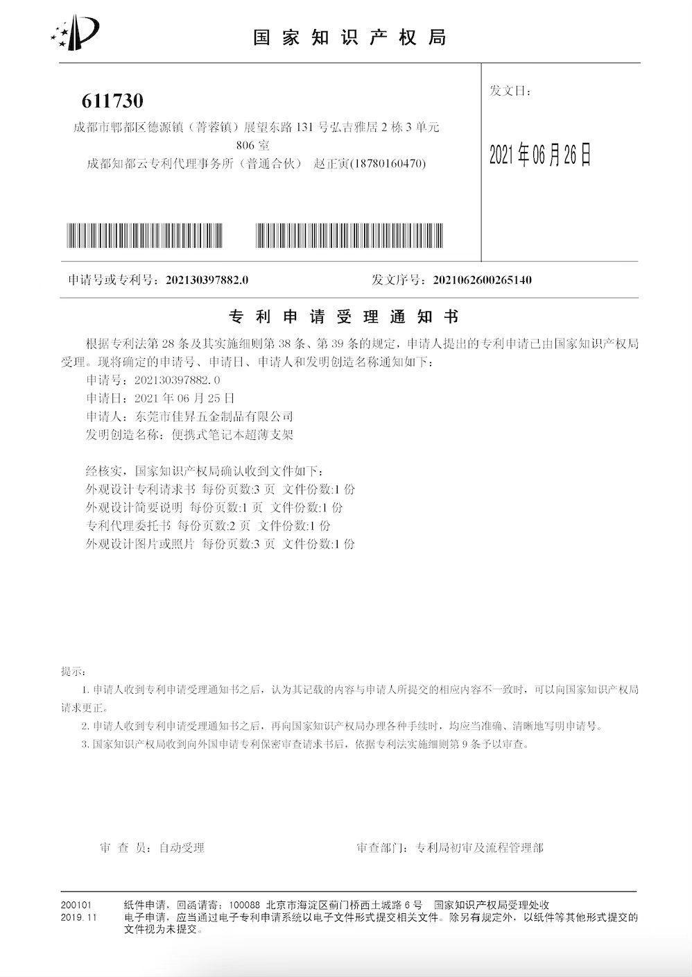 ◆ 專利權: 擁有8項由國家知識產權局頒發的外觀設計專利證書
